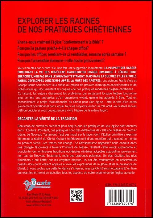Vous n'en êtes pas si sûrs? Ce livre fait une suggestion inquiétante: la plupart des usages ponctuant la vie des chrétiens d'aujourd'hui chaque dimanche à l'église sont enracinés, non pas dans le Nouveau Testament, mais dans la culture et les rituels païens développés longtemps après la mort des apôtres. Les auteurs Frank Viola et George Barna soutiennent leur thèse au moyen de preuves historiques convaincantes et de riches notes qui documentent les origines de nos pratiques modernes d'église chrétienne.